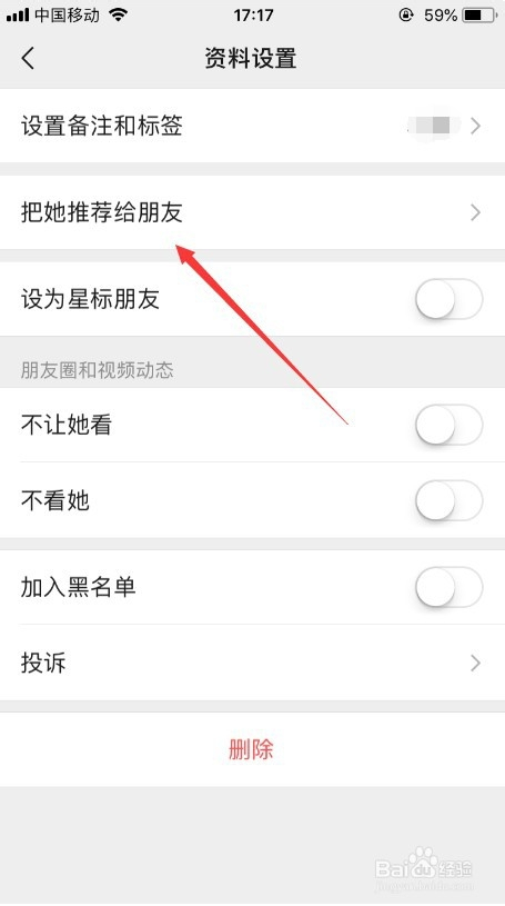 进入资料设置页后,选择此中的“把她/他保举给老友”,如图所示。