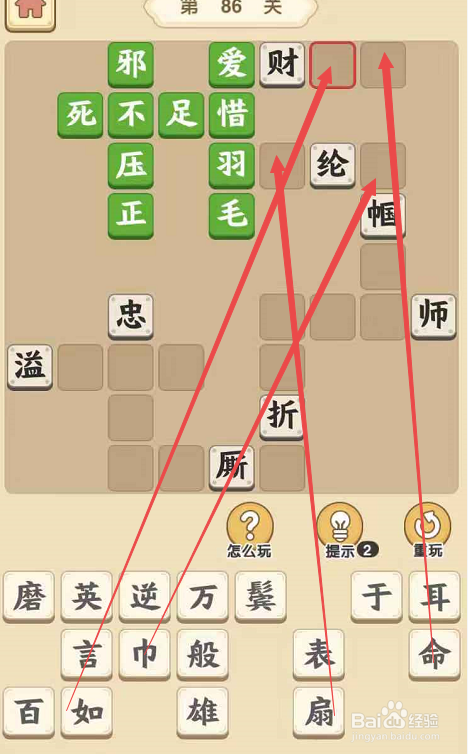 将“如”字填在“财”字后面,再将“命”填在“财”后面,构成当作语“一毛不拔”,之后将“扇”字填在“羽”字后面的空格,将“巾”字填在“纶”字后面,构成当作语“羽扇纶巾”。