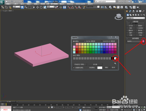 打开3Dmax2012软件,点击【建立】-【几何体】-【长方体】,在作图区域绘制一个长方体模子。点击【对象颜色】将模子的对象颜色设置为:白色;