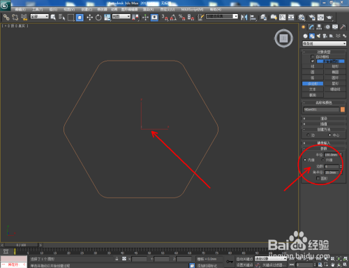 打开3Dmax2012软件,点击【建立】-【几何体】-【多边形】,按图示参数在作图区域绘制一个六边形图案。选中图案,点击【对象颜色】将图案的对象颜色设置为:白色;