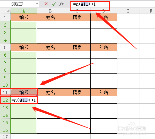 然后我们要输入公式,这时辰要看输入的单位格的位置,好比此刻这个是A12,我们的公式就是“=n(A11)+1”,法则是公式里的单位格是我们输入公式单位格的上一个。最后按下“Ctrl”+“Enter”,完当作!