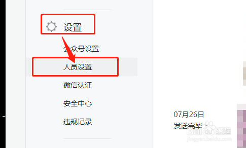 进入本家儿体公家号之后滑动鼠标看到最左侧的菜单选项,找到“设置”,在设置下面找到“人员设置”点击进入;