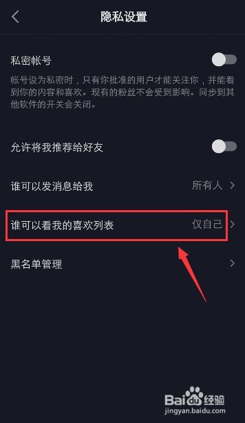 在隐私设置页面,就可以看到【谁可以看我的喜好列表】显示的是所有人,点击“ 所有人”就可以设置查看的权限。