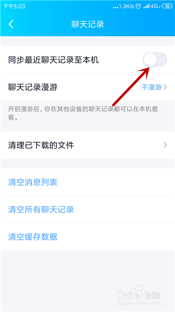 聊天记实中找到【同步比来聊天记实至本机】,点击后方的按钮开关。