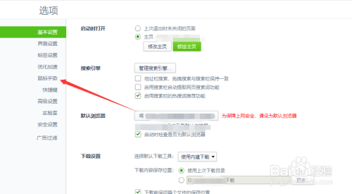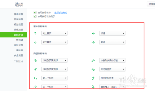 进入浏览器的设置功能之后,选择左侧菜单中的“鼠标手势”,如图所示。