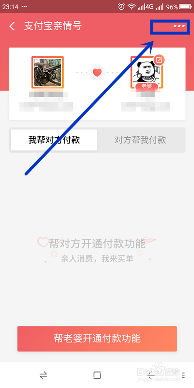 在弹出的“支付宝亲情号”页面右上角,找到“三个横点”图标单击