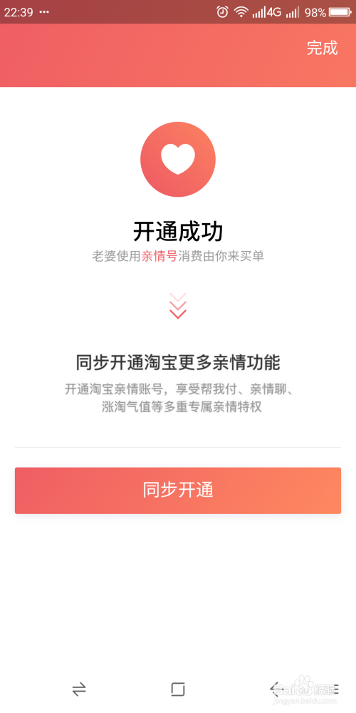 颠末你的密码验证(支付指纹或者密码)之后,亲情号就正式开通,若是你愿意可以同步开通“淘宝亲情号”,让确认淘宝购物也能由你买单