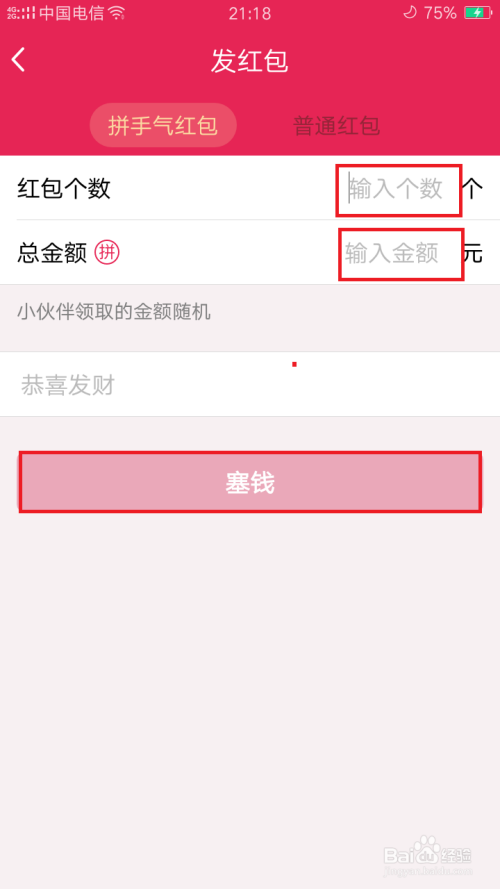你可以选择拼手气红包或通俗红包输入红包个数和总金额,输入密码即可。