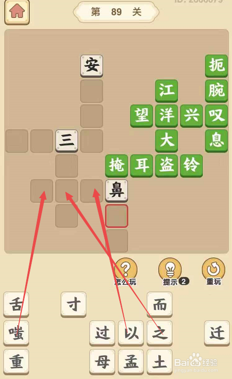 将“土”字填在“安”字下面,将“重”字填在“土”字下面,构成当作语“安土重迁”,然后将“而”字填在“鼻”字下面,将“过”字填在“而”字下面,构成当作语“掩鼻而过”。