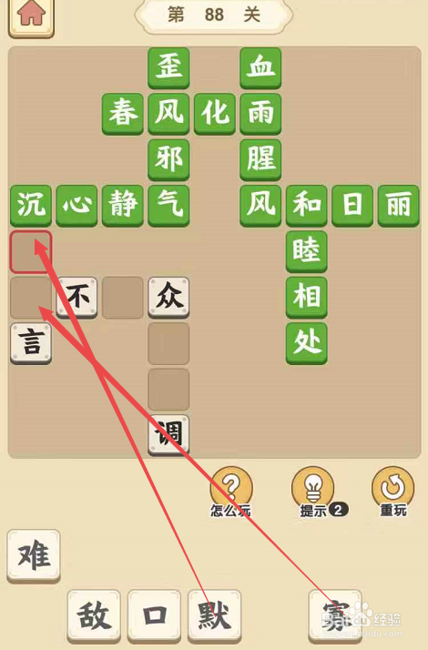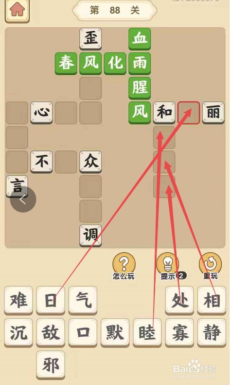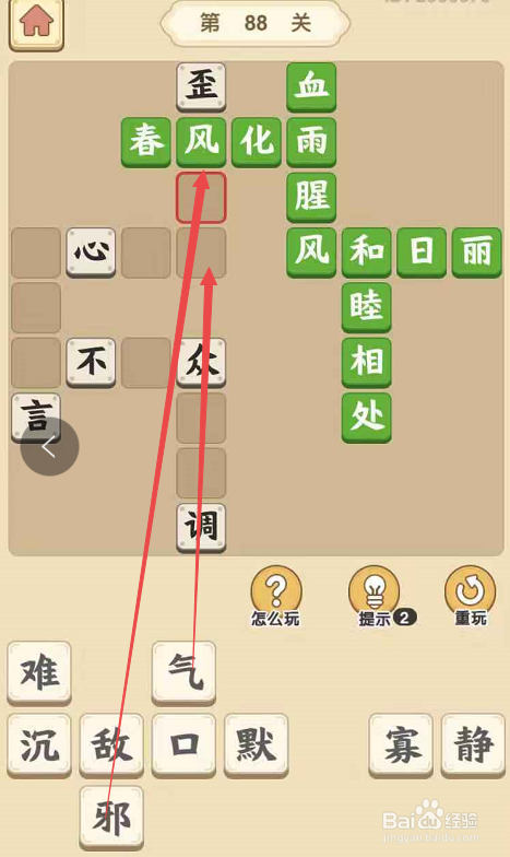 点击当作语小秀才手游第八十八关,起头第八十八关的填字挑战。将“春”字、“风”字填在“化”字前面的空格,将“雨”字填在“化”字后面的空格,构成当作语“春风化雨”。然后将另一个“风”字填在“腥”字下面的空格,构成当作语“血雨腥风”。