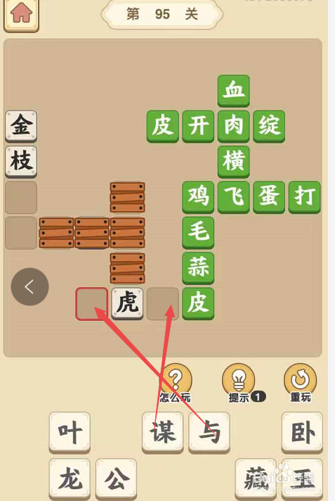 将“与”填在“虎”的前面,将“谋”填在“虎”和“皮”之间,构成当作语“与虎谋皮”,同时断根“虎”字上面的三个障碍。
