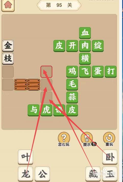 将“藏”、“龙”、“卧”字别离填在“虎”字上面的三个空格内,构成当作语“藏龙卧虎”,同时消弭“龙”左侧的障碍。