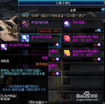 红鼻子德拉的商铺(新版本)内添加了净化的异形结晶。可以利用十个异形结晶兑换,利用后会获得一个异形结晶,是账号的绑定材料。然后把大号刷深渊所收集的异形结晶,兑换当作净化的异形结晶,转给小号。这样可以提高搬砖的效率。