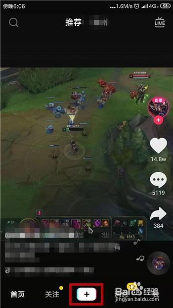 打开手机中的抖音短视频,在首页中点击底部的【+】选项。