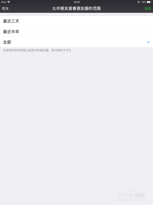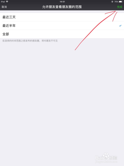 选择好了之后点击完当作,万万别忘了点击完当作,许可伴侣查看朋友圈的规模就设置好了。