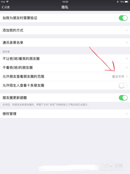 以许可伴侣查看朋友圈的规模为比来半年为例,点击这一选项,在选项的后面会呈现一个对号。