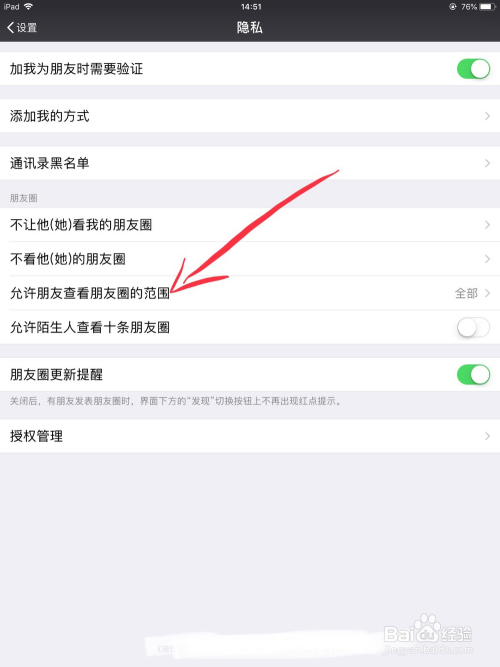 进入后,找到“许可伴侣查看朋友圈的规模”选项,打开此选项。