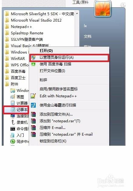 首先点窜需要毗连打印机电脑上的Hosts文件(不是已毗连打印机的电脑),Hosts文件在C:\Windows\System32\drivers\etc下,有的Win7打开该文件提醒“没有权限点窜”,请在附件中的“记事本”图标上右键单击呈现选项卡里,选择“以办理员权限运行”,再在记事本里打开文件就可以点窜保留了