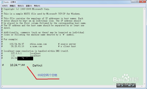 在打开的hosts文件里,添加上打印机地点的电脑的IP地址和计较机名称,格局如图,计较机名称和ip地址之间保留两个空格