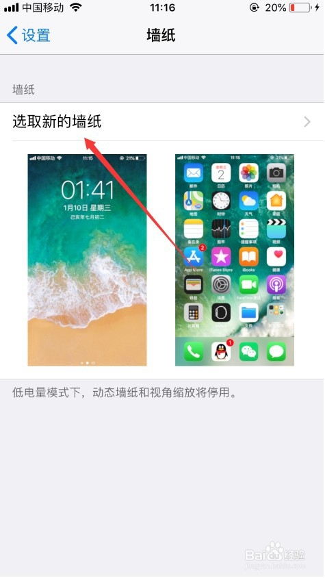 进入墙纸设置之后,点击此中的“拔取新的墙纸”,如图所示。