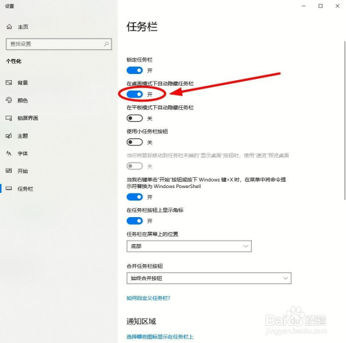 我们单击该按钮,开关由灰色酿成蓝色,暗示打开该功能。今后只要在系统桌面模式下,使命栏会主动埋没,从而扩大显示桌面画面比。