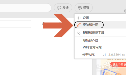然后在弹出的窗口右上角点击“设置”这一项,点击今后即可看到下图二所示的“皮肤和外不雅”了;