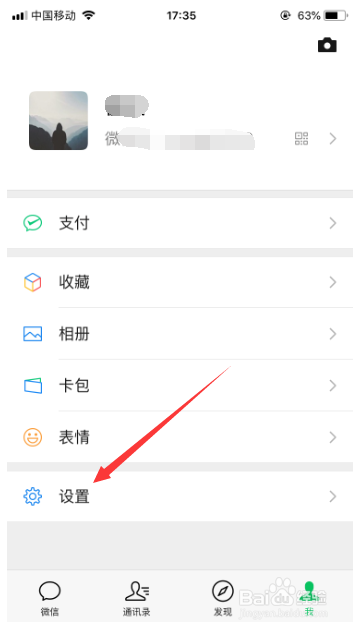 打开登录微信之后,进入微信,点击右下角的“我”,然后在选择此中的“设置”,如图所示。