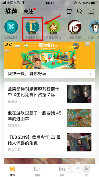 方式2 第二种方式和第一种大同小异,在保举里找到英雄联盟游戏,点击进入。