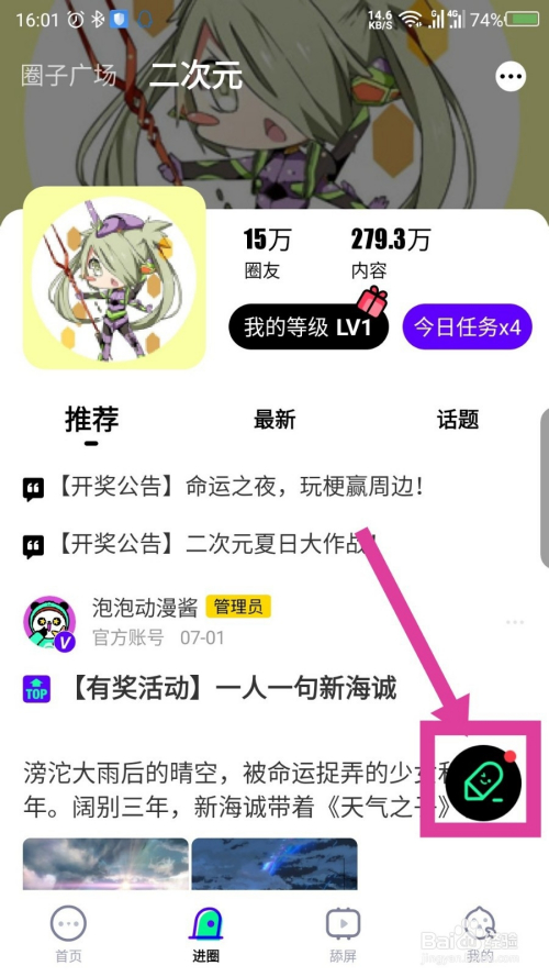 在圈子里面,点击右边悬浮的图标。如图所示