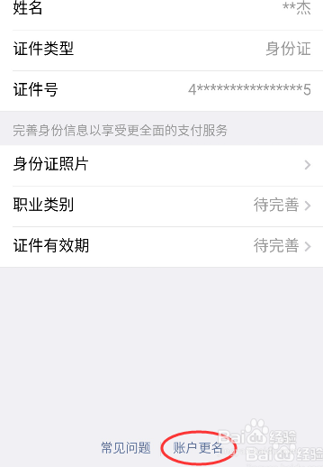 和前面实名认证的进口一样,实名认证进口: 【我】-【支付】-右上角的【...】 就进入了 【支付办理】页面然后点击【已认证】,进入【实名认证中间】然后点击【账户改名】进入【刊出微信支付】页面