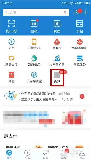 可以在支付宝长进行余额查询及缴费,打开支付宝后点击【更多】。