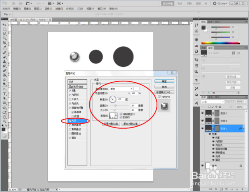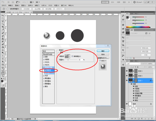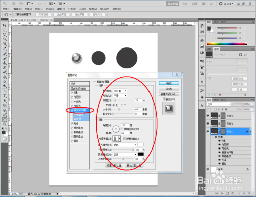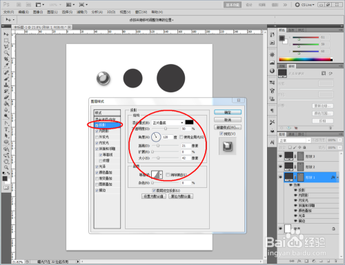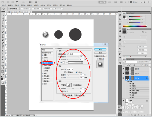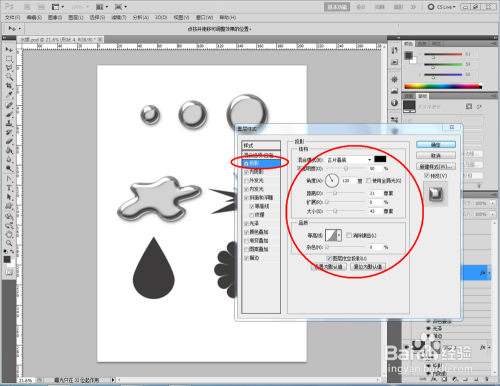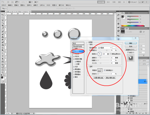 鼠标双击图示空白区域,弹出【图层样式】设置栏,勾选【投影】、【内暗影】、【内发光】、【斜面和浮雕】、【光泽】、【描边】以及【颜色叠加】,并按图示设置好对应的各个参数,完当作圆形图案的水银结果建造;