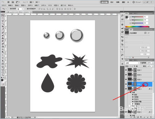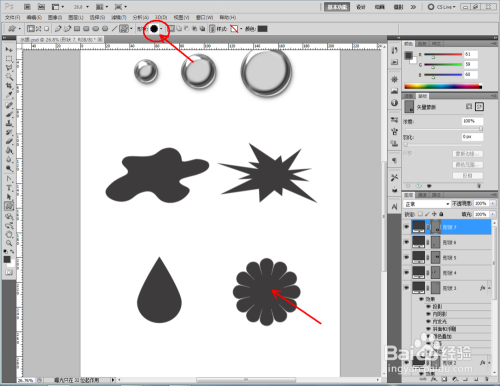 点击【自界说外形东西】,点击【外形图层】并将颜色设置为:黑色后,依次在作图区域绘制出四个分歧外形的自界说图案(如图所示);