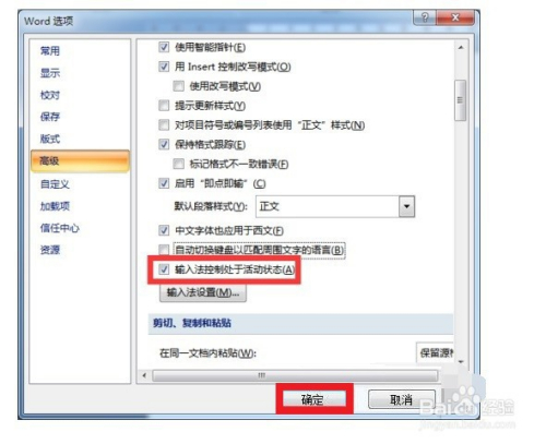 2从打开的“Word选项”界面中,切换到“高级”选项卡,勾选“输入法节制处于活动状况”项,点击“确定”完当作设置。