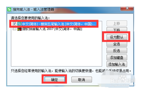 6从打开的“输入法办理器”窗口中,勾选要利用的中文输入法,点击“设为默认”按钮,再点击“确定”按钮。