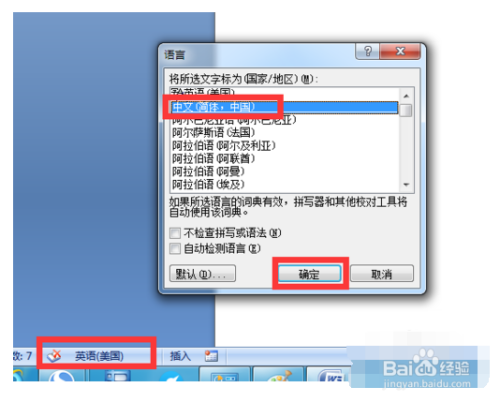 4点击Word文档左下角的“英文(英国)”按钮,从弹出的“说话”窗口中,选择“中文(简体、中国)”项,点击“确定”按钮。
