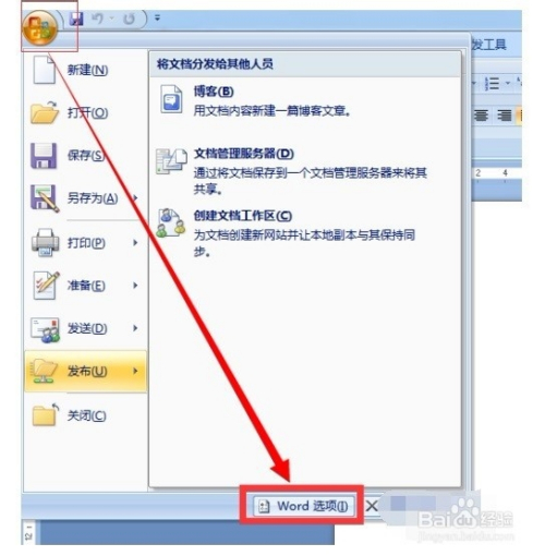1查看一下Word中相关设置是否正常。点击“Office按钮”从打开的扩展菜单中点击“Word选项”按钮。