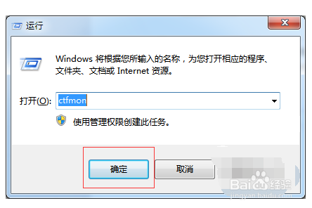 7当以上方式无法解决Word中显示输入法状况栏的问题时,我们可以打开“运行”窗口,输入“ctfmon”,并按回车来从头加载一下输入法程序。