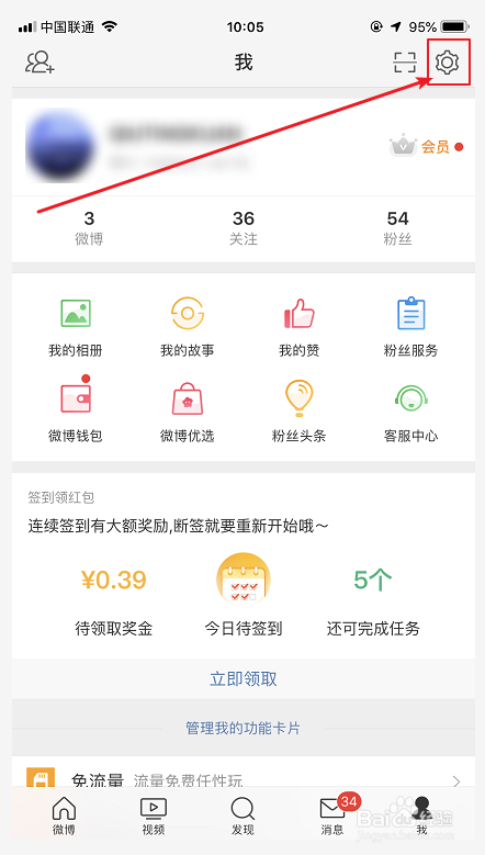 打开新浪微博APP点击底部菜单栏最后一个图标【我】