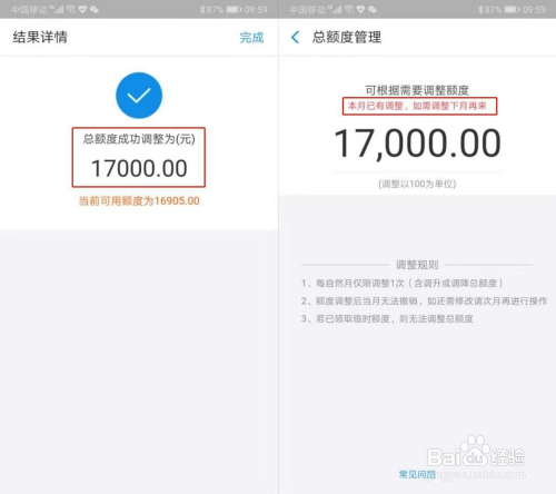 此刻,花呗额度已经调整好了。需要注重的是花呗额度每月只能调整一次。