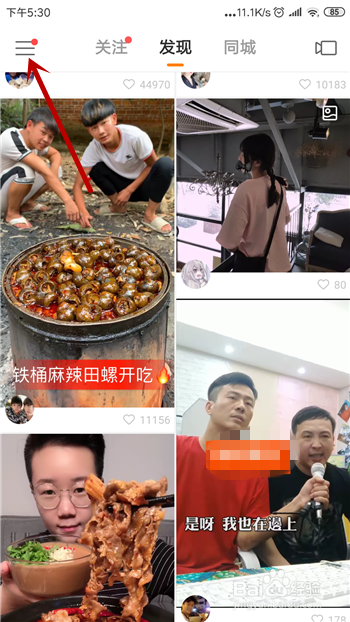 点击打开快手,在快手的视频里点击左上角的【三】按钮。