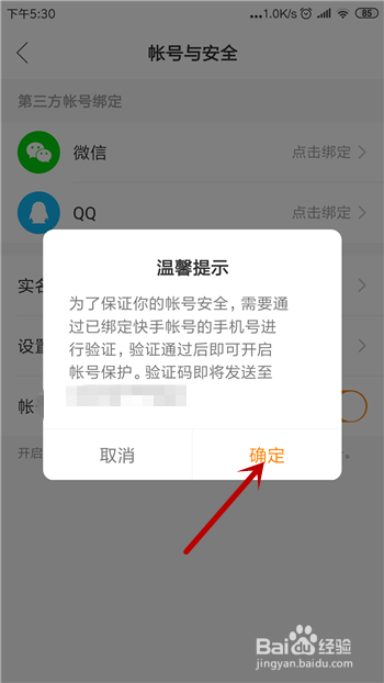 在开启前系统提醒我们需要进行手机验证,点击【确定】。