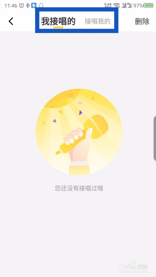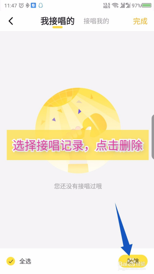 在打开的接唱记实界面,点击右上角的删除。如图所示