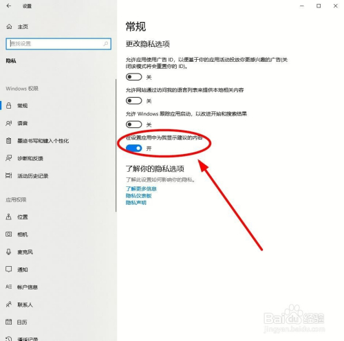 在右边的常规功能选项汇中可以看到“在设置应用中为我显示建议的内容”选项按钮是蓝色,暗示该功能是默认打开的。