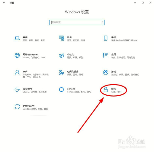 在Windos设置页面,找到“隐私”选项单击