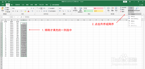 主动填充后选中适才填充的一列随机数,再点击升序或降序