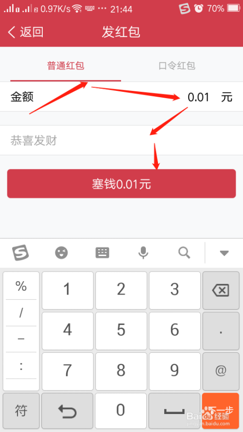 在发红包界面,选择红包类型,输入红包金额,编纂红包上的文字。之后点击“塞进红包“。