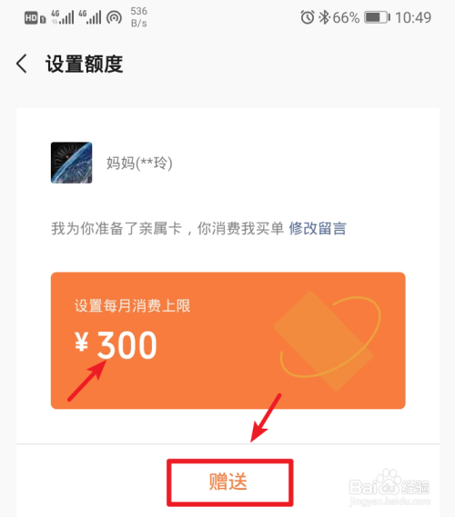 点击赠予后,在设置额度界面,设置每月消费的额度上限,点击下方的赠予。