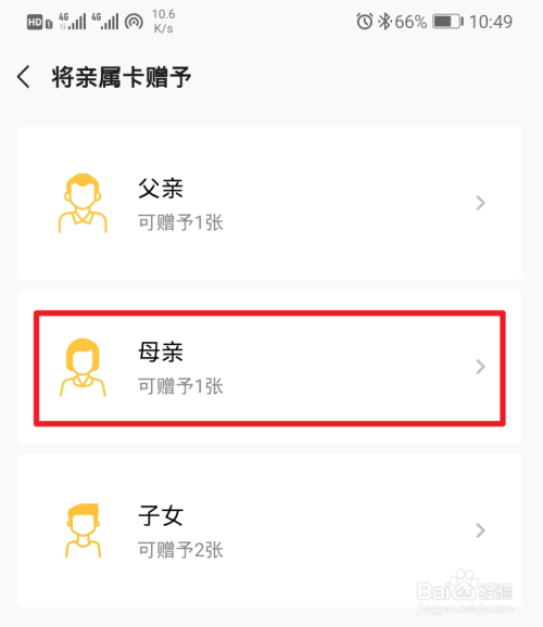 进入亲属卡设置界面,选择赠予的选项。