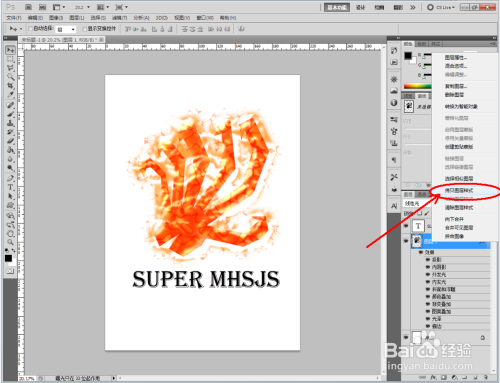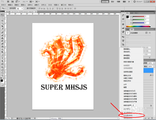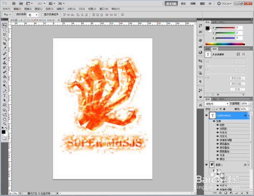 点击【文字东西】,按图示设置好文字大小、字体、颜色等各个参数后,输入文字内容:SUPER MHSJS。完当作后,将自界说图案图层的图层样式拷贝粘贴到文字图层即可。
